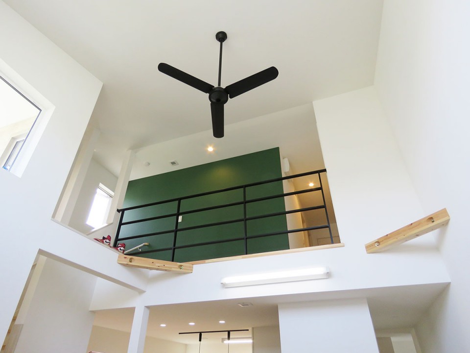 杉柄のフローリング、深みのあるマットブラックのアイアン手摺、2階のグリーンクロス等々、大空間リビングを引き立てます。家族全員が集い、暮らしの中心となるやすらぎの場にこだわりを集中させた、施主様らしい空間づくりの楽しみ方です。また天井のシーリングファンでより快適な環境となるよう空調管理を行っています。