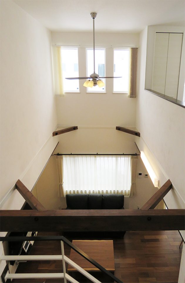 ▲ LDKの吹き抜けを見上げると、シーリングファンと三つの窓。自然の光がきらやかに差し込みます。