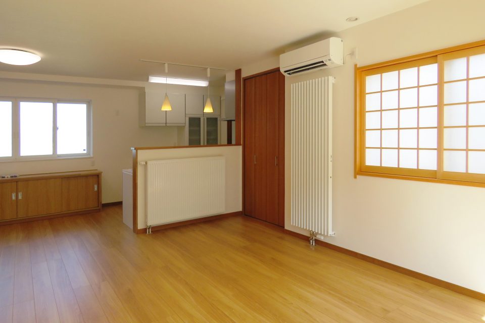エアコン1台と輻射熱を利用して部屋を暖めるパネルヒーターが2台設置してあるLDK。組み合わせて使うことで、効率よく部屋を暖めることが出来ます。