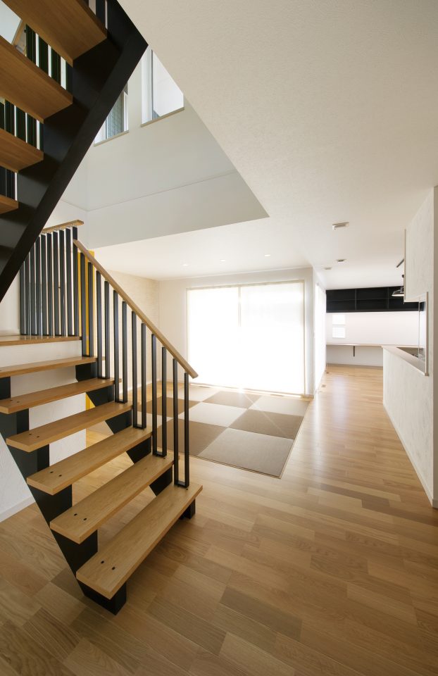 リビング階段は、手摺の小柱と蹴込のないスケルトン部分の空間が開放感を高めていると同時に、踏板のウッドと金属部分との対比も見事。
