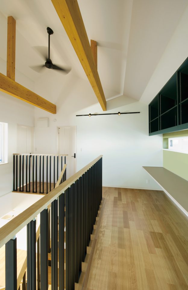 階段上部は、2階の勾配天井までの吹抜け大空間。「縦方向」の開放感に加えて、家族の気配がどこにいても常に感じられる工夫がなされています。