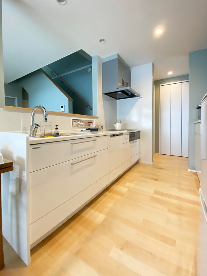 ▲ 家族並んで楽しく料理が出来るキッチン。奥にはパントリーとして使える収納。