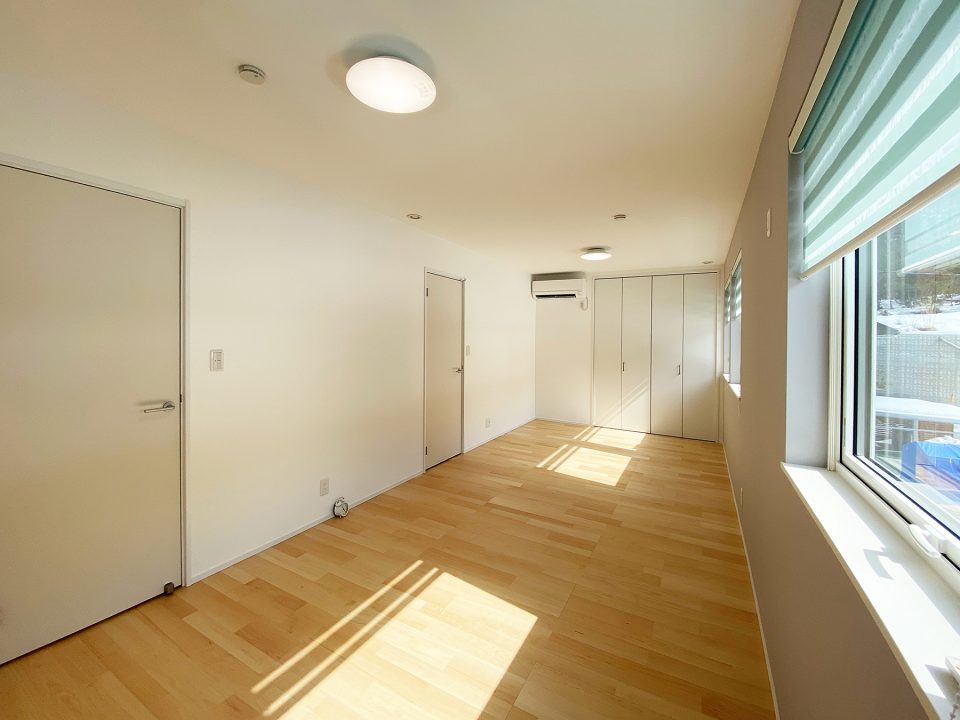 グレーのカラークロスを使用した2階の主寝室と子供室。主寝室には落ち着きを感じるグレーカラー。ウォークインクローゼットには2階で使用するものがたっぷりと収納できる空間。2間オープンにして使っても良し、扉で区切って使用しても良しの収納物を使い分けることができる、フレキブルな収納スペースです。