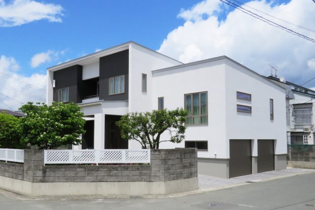 真っ白な外壁にステン色のサッシがマッチしたエレガントな外観。