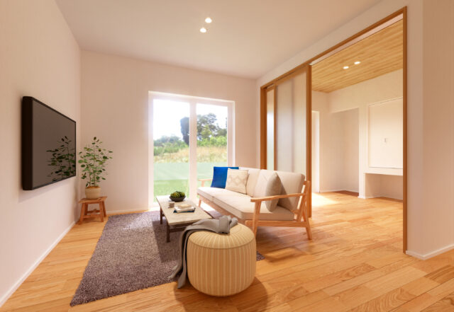 ①普段は開放的なリビングとして使い、スライド扉を閉めれば客間としても活用できる間取りです。