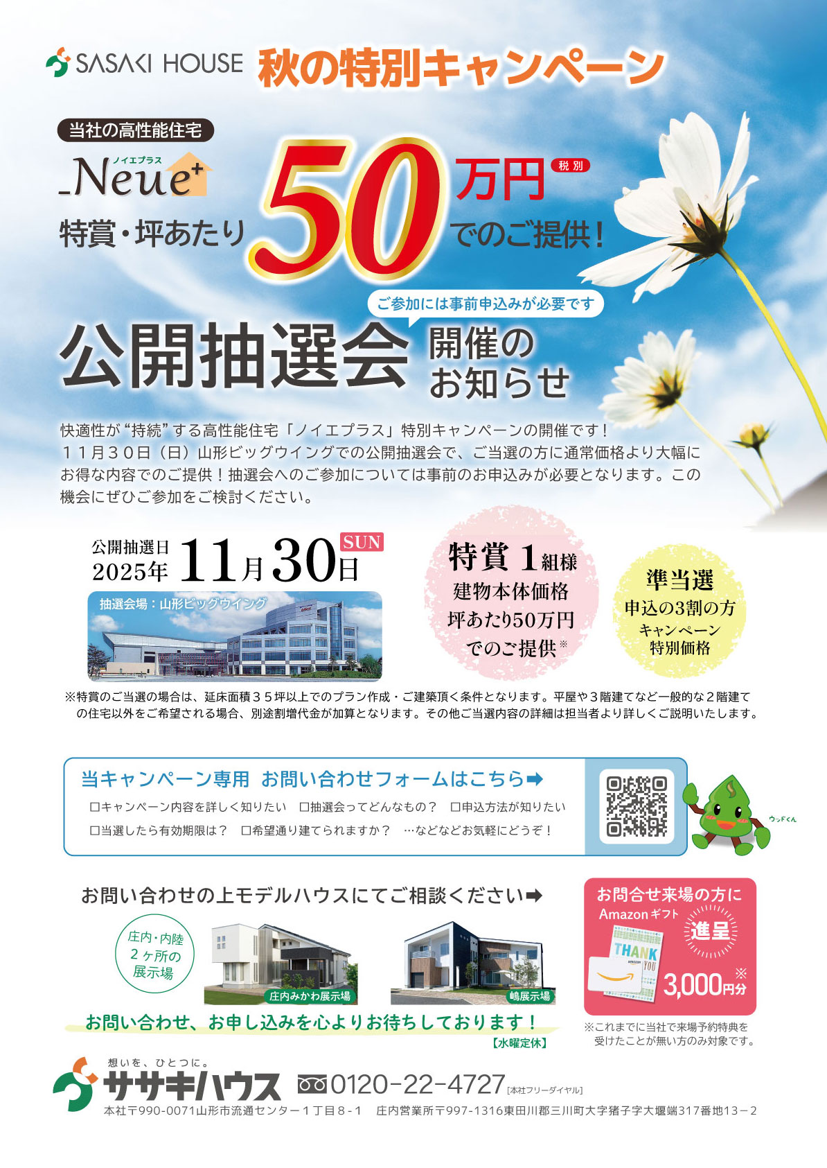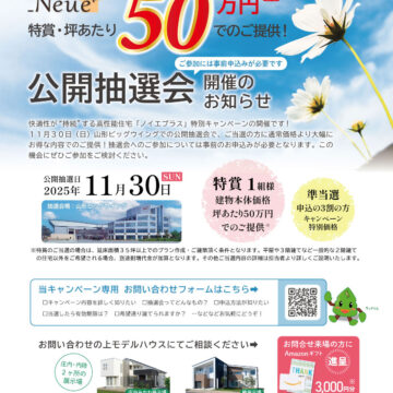 当社の高性能住宅の『ノイエプラス』が公開抽選会にて、(本体価格)特賞・坪当たり50万円(税別)でのご提供です!
